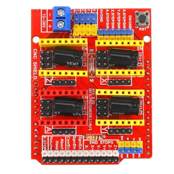 This arduino shield is very convenient to use and is suitable for development boards compatible with Arduino. This CNC shield compatible with Arduino is the latest version of the CN shield model (V 3.0). The CNC Shield is GRBL 0.9 compatible and with the help of jumper wires, it is accessible to stepper drivers.